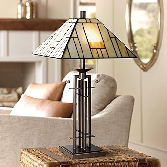 Mission Tiffany Style Table Lamp Art Deco 26 25 High Wrought Iron Dark Bronze Brown Gold White Stained Glass Shade For Living Room Bedroom House Bedside Nightstand Home Office Franklin Iron Works